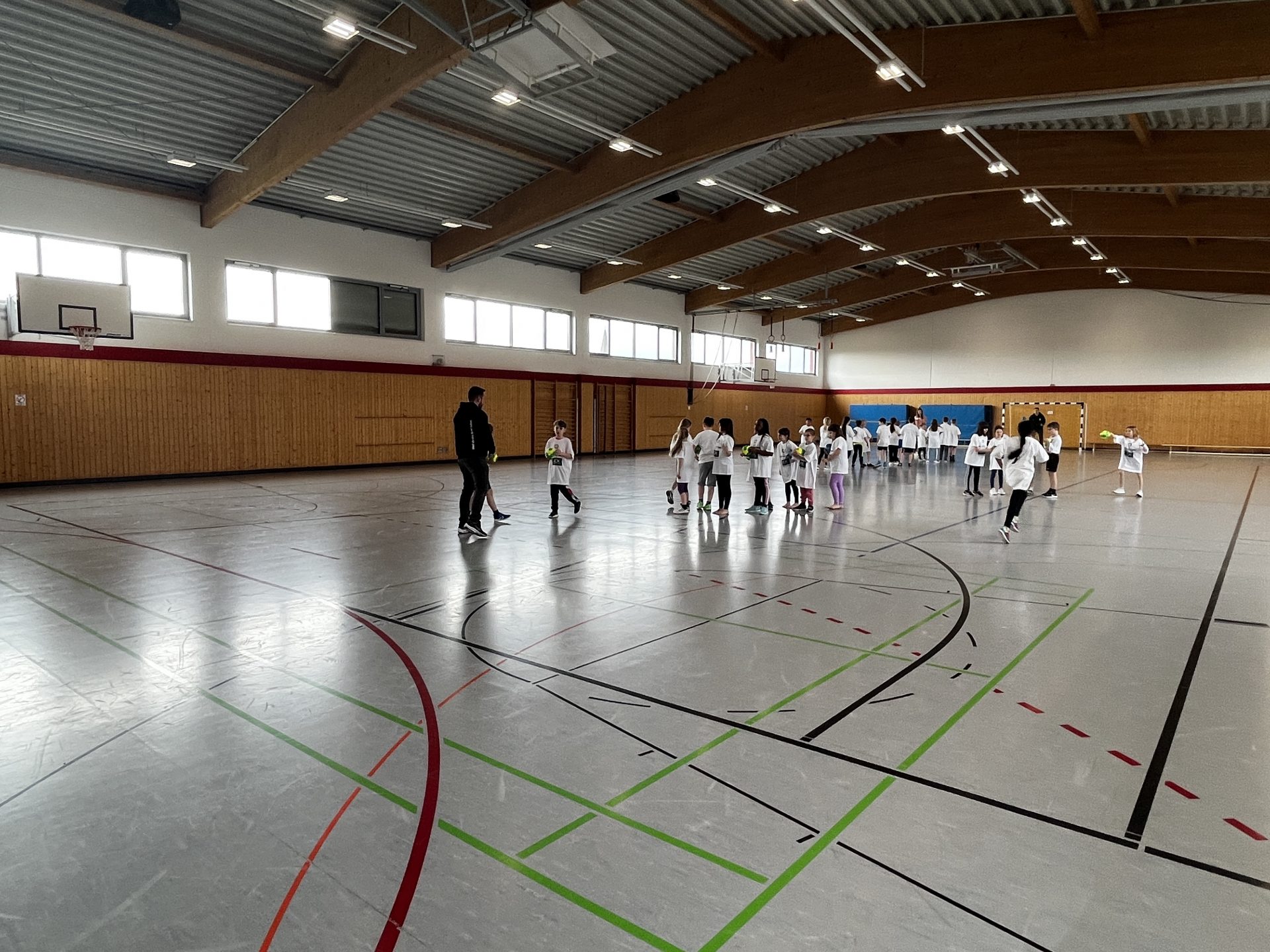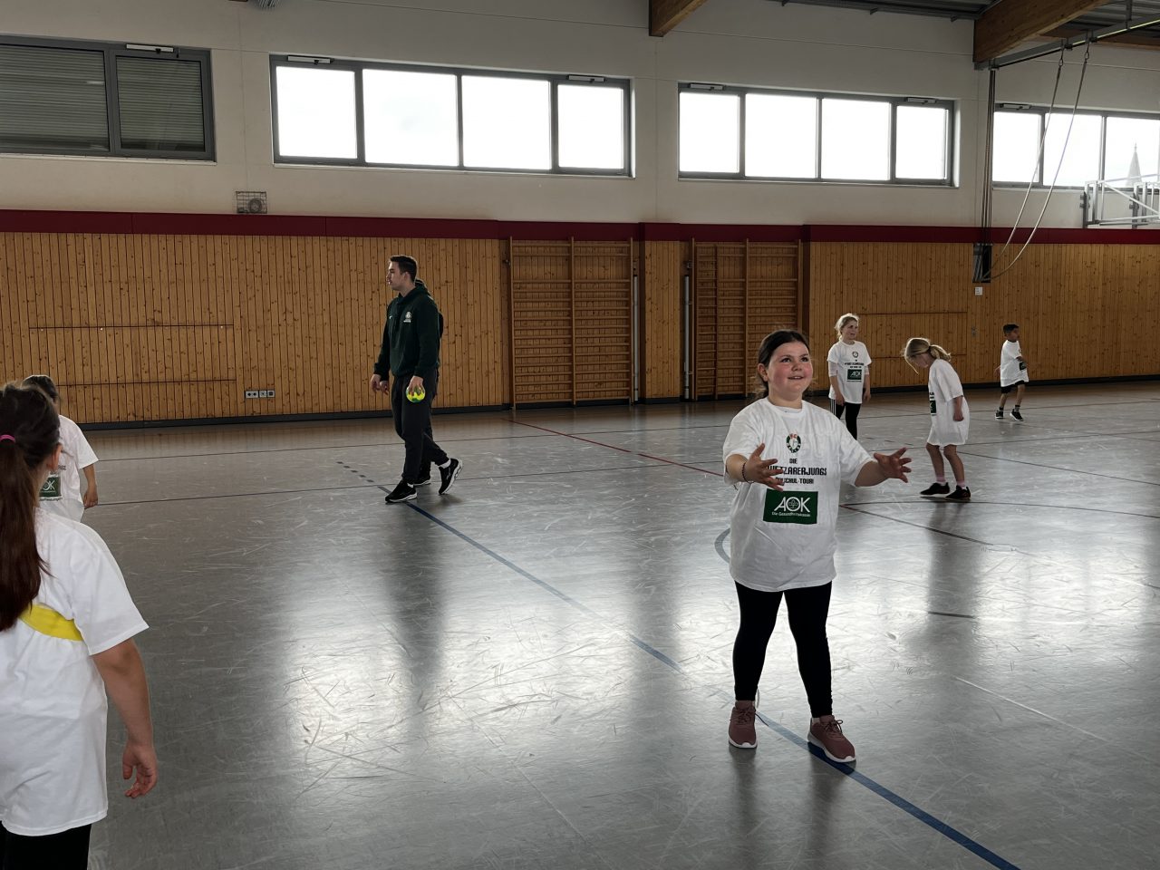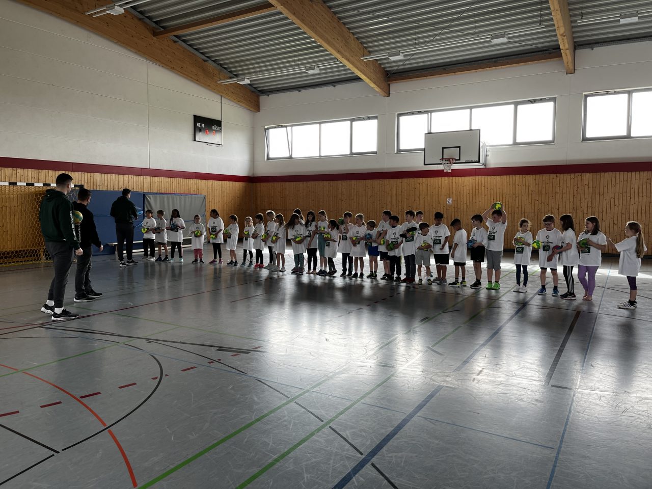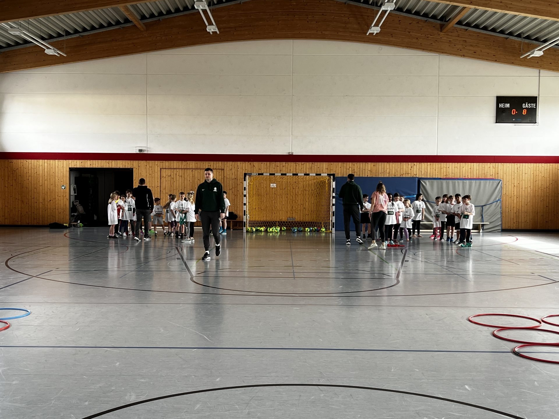 Als 3a/3b in der Halle eingetroffen warn, haben wir uns begrüst. Die Spieler haben sich vorgestellt. Sie haben uns Trikots geschenkt. Die uns leider ein bischen zu groß waren. Nun ging es endlich los. Als erstes haben wir uns in Gruppen aufgeteilt und haben Tik-Tak-To gespielt. Das hat Spaß gemacht. Anschließend haben wie eine kleine Trinkpause gemacht.