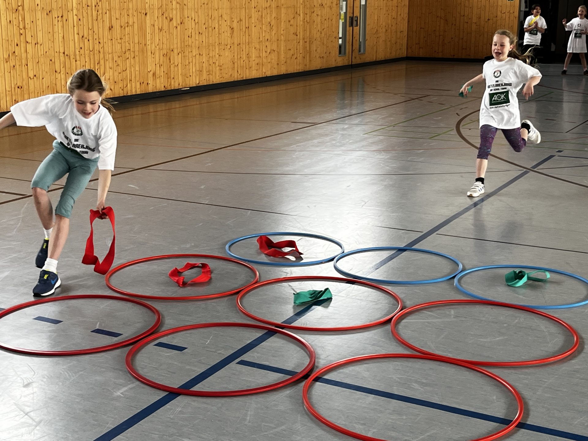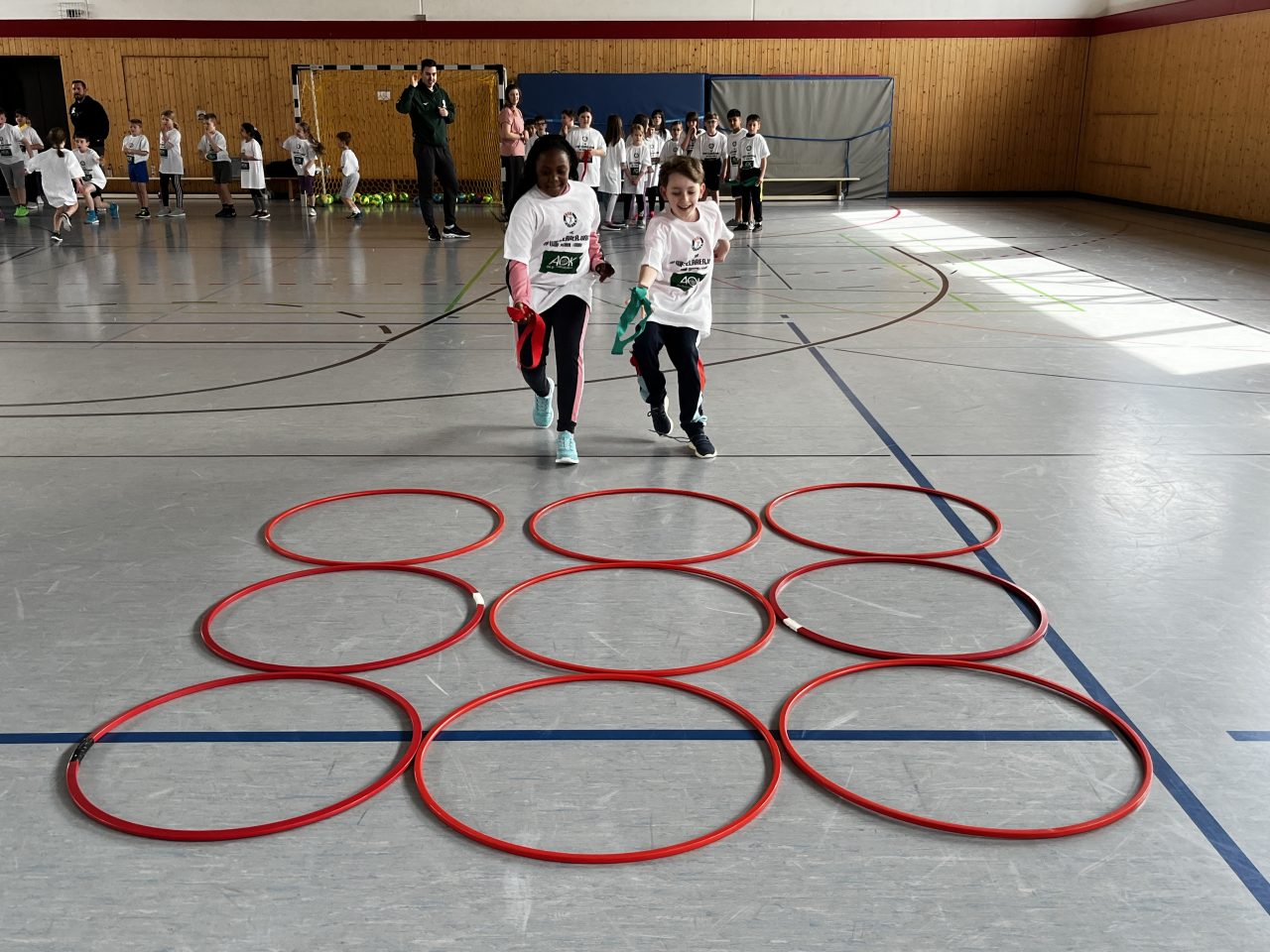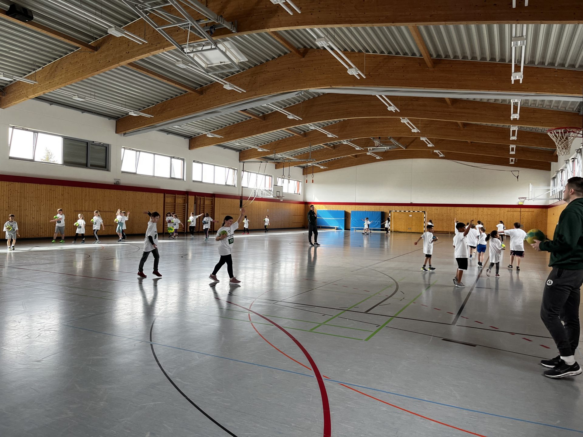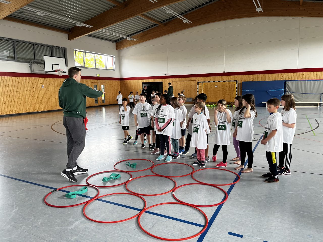 Als 3a/3b in der Halle eingetroffen warn, haben wir uns begrüst. Die Spieler haben sich vorgestellt. Sie haben uns Trikots geschenkt. Die uns leider ein bischen zu groß waren. Nun ging es endlich los. Als erstes haben wir uns in Gruppen aufgeteilt und haben Tik-Tak-To gespielt. Das hat Spaß gemacht. Anschließend haben wie eine kleine Trinkpause gemacht.